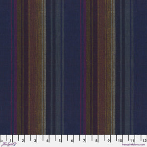 Variegated multi color, vertical, woven stripe from Kaffe Fassett. Yarn dyed, shirt weight 100% cotton, 44" wide.