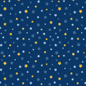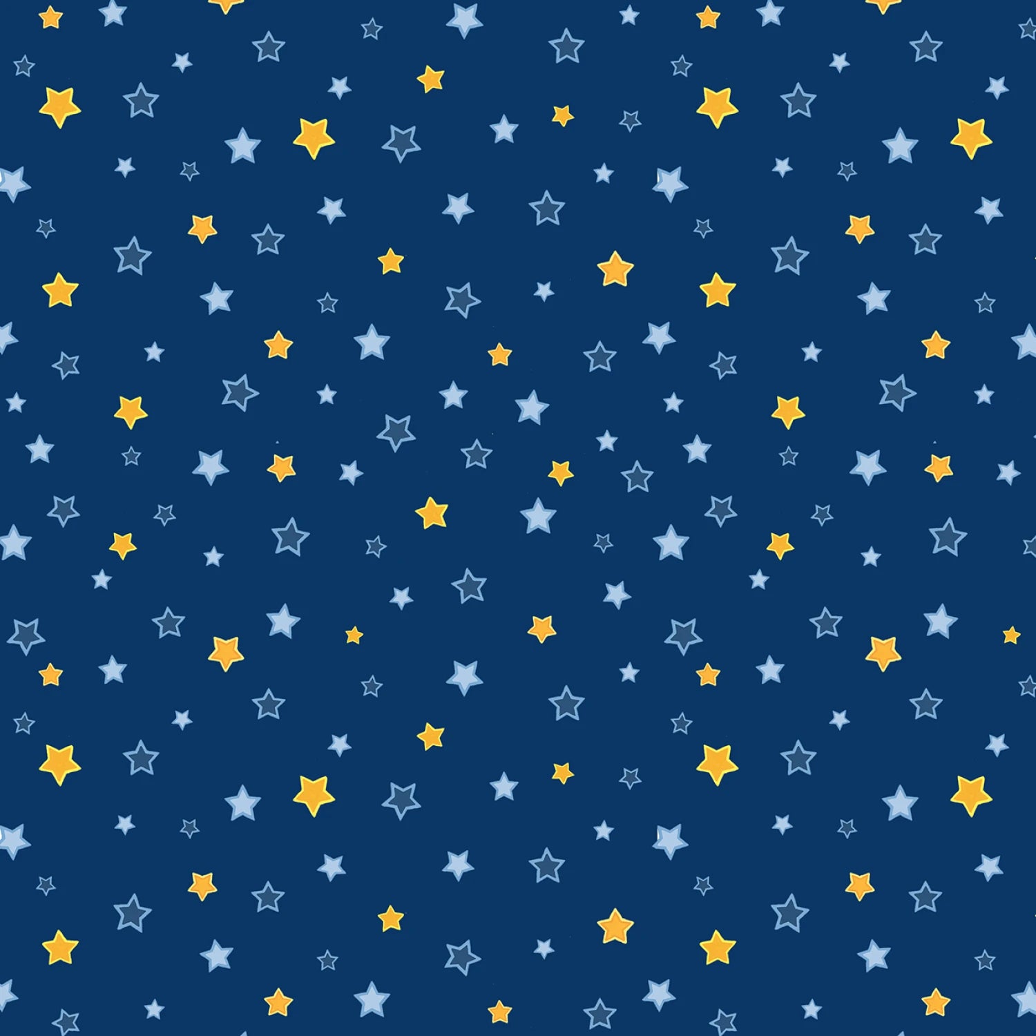A toss of small yellow and light blue stars of varying sizes on a navy blue background. From the Tomtens Folklore Christmas Collection by Eva Melhulsh for Lewis & Irene. 100% Cotton, 44/45" wide.