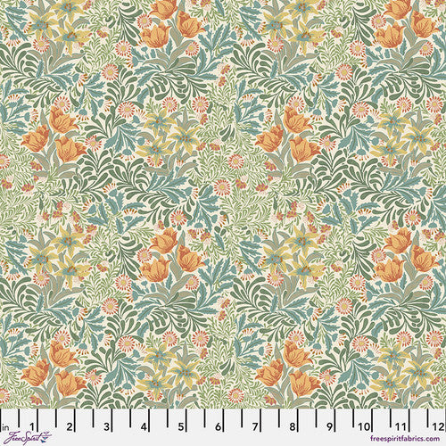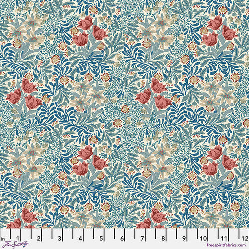 Lush ferns, pale green leaves, and yellow dandelions fill the space around clusters of three red roses. In both tones of rich blues with reds or delicate greens with rust. From the Emery Walker's House collection for FreeSpirit Fabrics. 100% cotton, 44/45" wide.