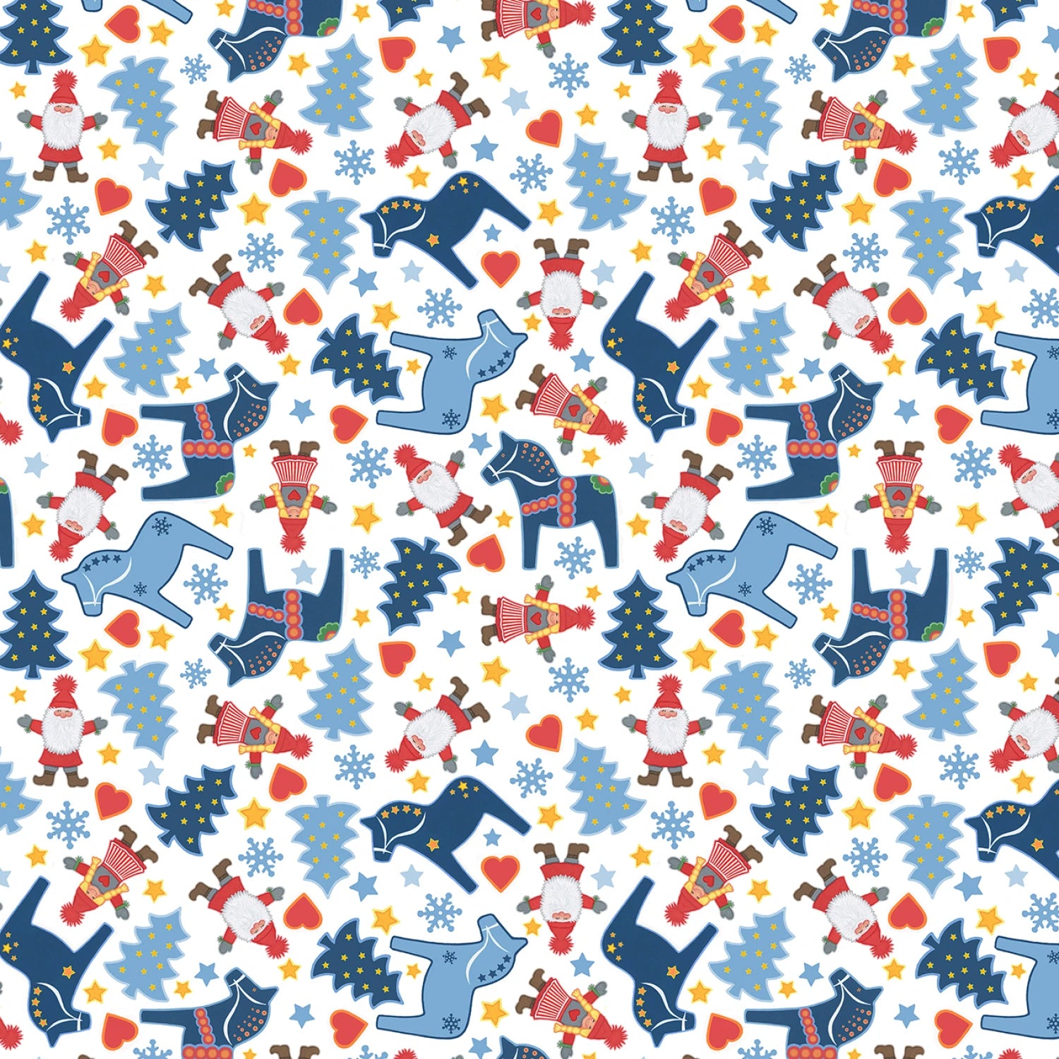 A toss of Dala horses, Christmas dolls, hearts, trees, and snowflakes in shades of blue, gold and red. From the Tomtens Folklore Christmas Collection by Eva Melhulsh for Lewis & Irene. 100% Cotton, 44/45" wide.