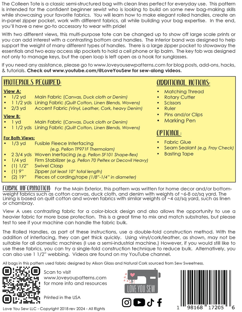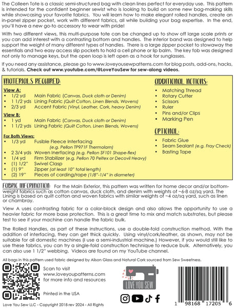 The Colleen Tote is a classic semi-structured bag with clean lines perfect for everyday use. This pattern is intended for the confident beginner sewist who is looking to build on some new bag-making skills while showcasing your favorite fabrics. You will learn how to make elegant rolled handles, create an in-panel zipper pocket, work with different fabrics, all while building your bag expertise. In the end, you’ll have a new go-to accessory to wear with pride!