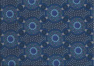 This fabric is blue with teal and a little bit of purple. White dots throughout. Circular Aboriginal patterns. By Marlene Doolin for M & S Textiles. 100% cotton, 44" wide.