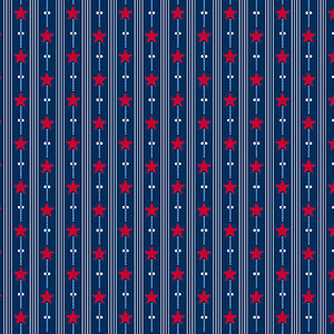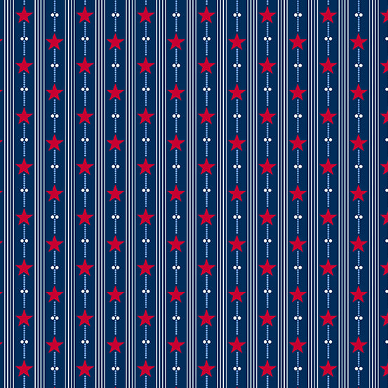 Columns of red stars on a navy blue background, connected by delicate baby blue and white dotted lines and separated by white stripes. From the Salute collection for Andover Fabrics - 100% cotton, 44/5"
