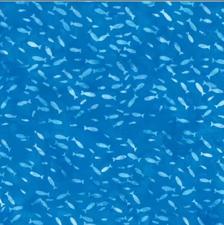 Blue batiks featuring schools of little fish. By Susan Claire for Hoffman. 100% Cotton, 43/44in