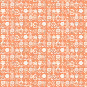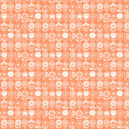 Rows of assorted white flowers in silhouette on a bright orange background. From the Kanpeki Na Hi Collection by Hitomi Osumi for Cotton & Steel. 100% cotton, 44/45" wide.