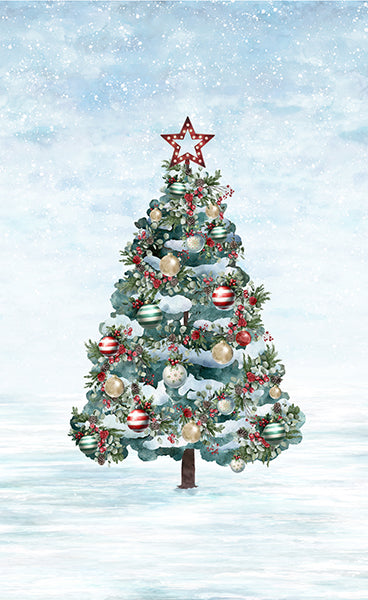A large, beautifully rendered Christmas tree that stands against a soft blue background, covered in red and gold ornaments with holiday flora. From the Cozy Tidings Collection for Hoffman Fabrics. 100% cotton, 26 3/4” x 42 1/2” panel.