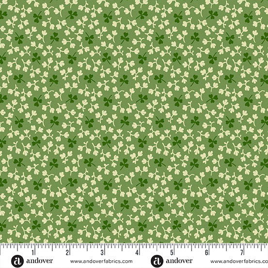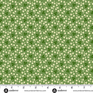 Delicate green Clovers surrounded by slightly smaller white ones on a green background. From the Little Clover Collection for Andover Fabrics. 100% Cotton, 44/45" wide.
