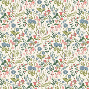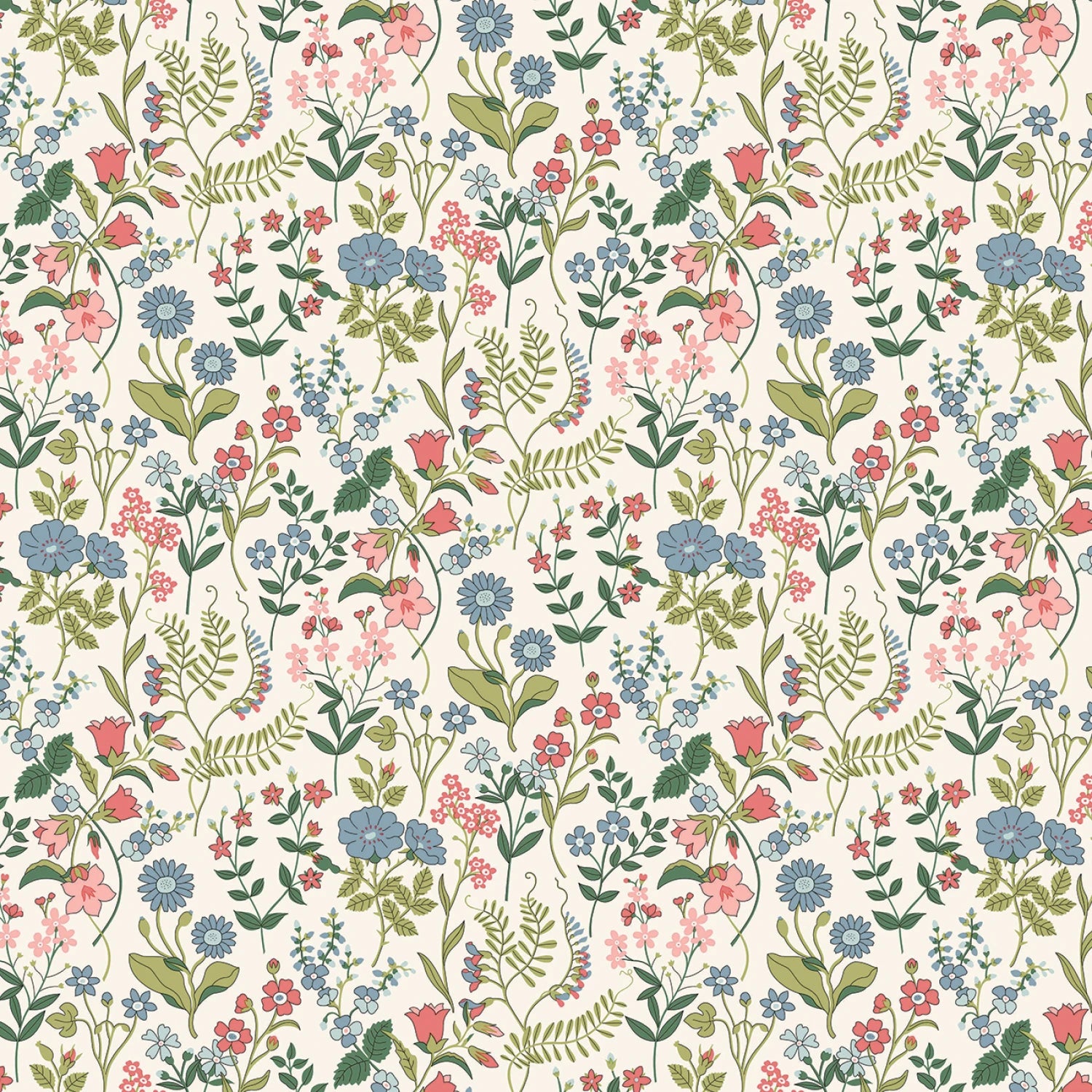 A larger toss of bright blue and pink flowers with their green foliage on a bright white background. From the Flower Shop Collection for Liberty Fabrics. 100% Cotton, 44/45" wide.