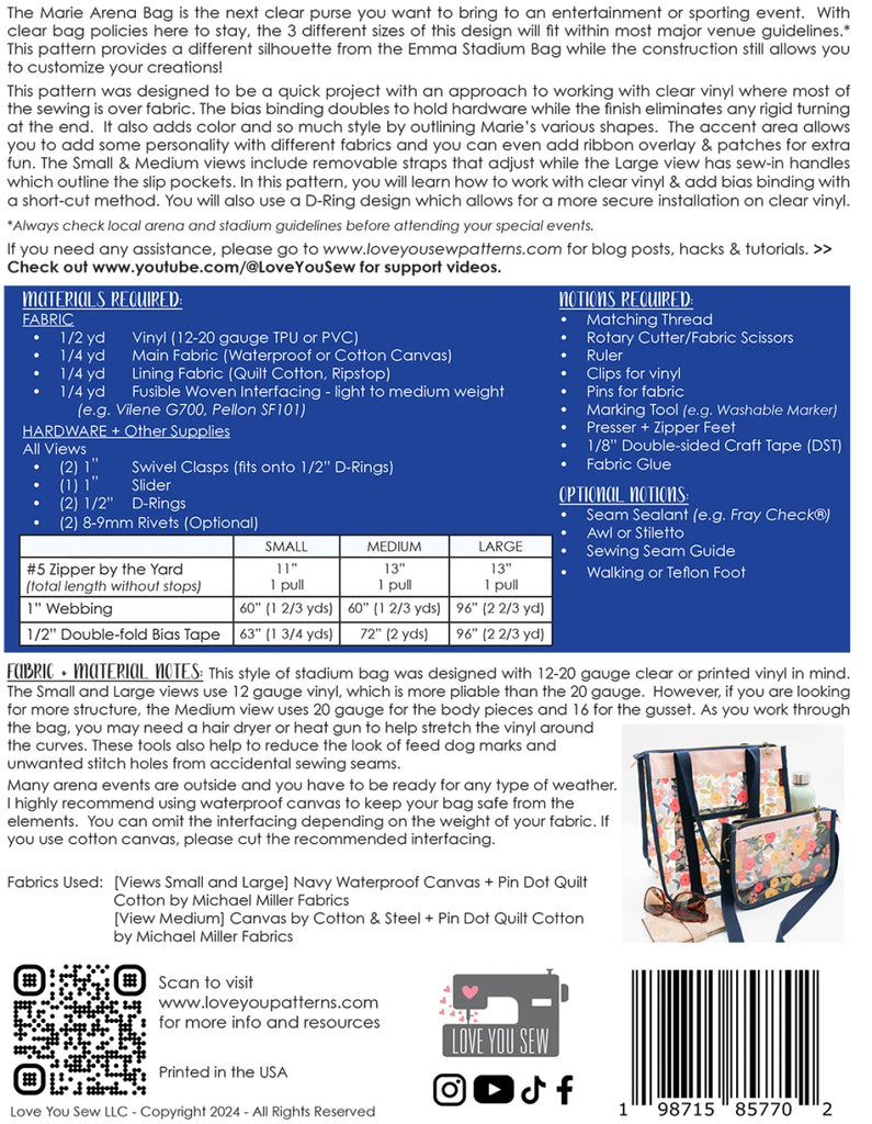 The Marie Arena Bag is the next clear purse you want to bring to an entertainment or sporting event. With clear bag policies here to stay, the 3 different sizes of this design will fit within most major venue guidelines. This pattern provides a different silhouette from the Emma Stadium Bag while the construction still allows you to customize your creations! This pattern was designed to be a quick project with an approach to working with clear vinyl where most of the sewing is over fabric. The bias binding doubles to hold hardware while the finish eliminates any rigid turning at the end.