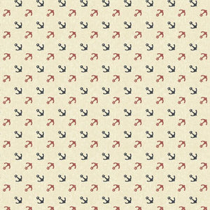 Rows of tiny, tilted anchors in alternating red and blue on a cream background. The design is printed to appear rough spun, reminiscent of sailcloth. From the Regatta Collection by Deirdre Coughlin for Marcus fabrics. 100% cotton, 44/45" wide.