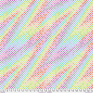 Tula Pink's True Colors Collection on an unbelievably soft Minky. Minky is a synthetic fabric made from top-quality polyester fibers that are silky smooth and very soft. This pattern features brilliant waves of xes, dots and pluses arranged in a dreamy diagonal pattern. 100% Polyester, 60" wide.