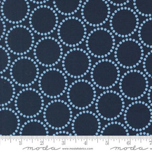 Rings of dots tightly fill a dark blue background in neat diagonal rows. From the Love Letter Collection by Lizzy House for Moda. 100% Cotton, 44/45" wide.
