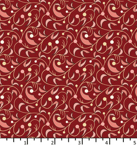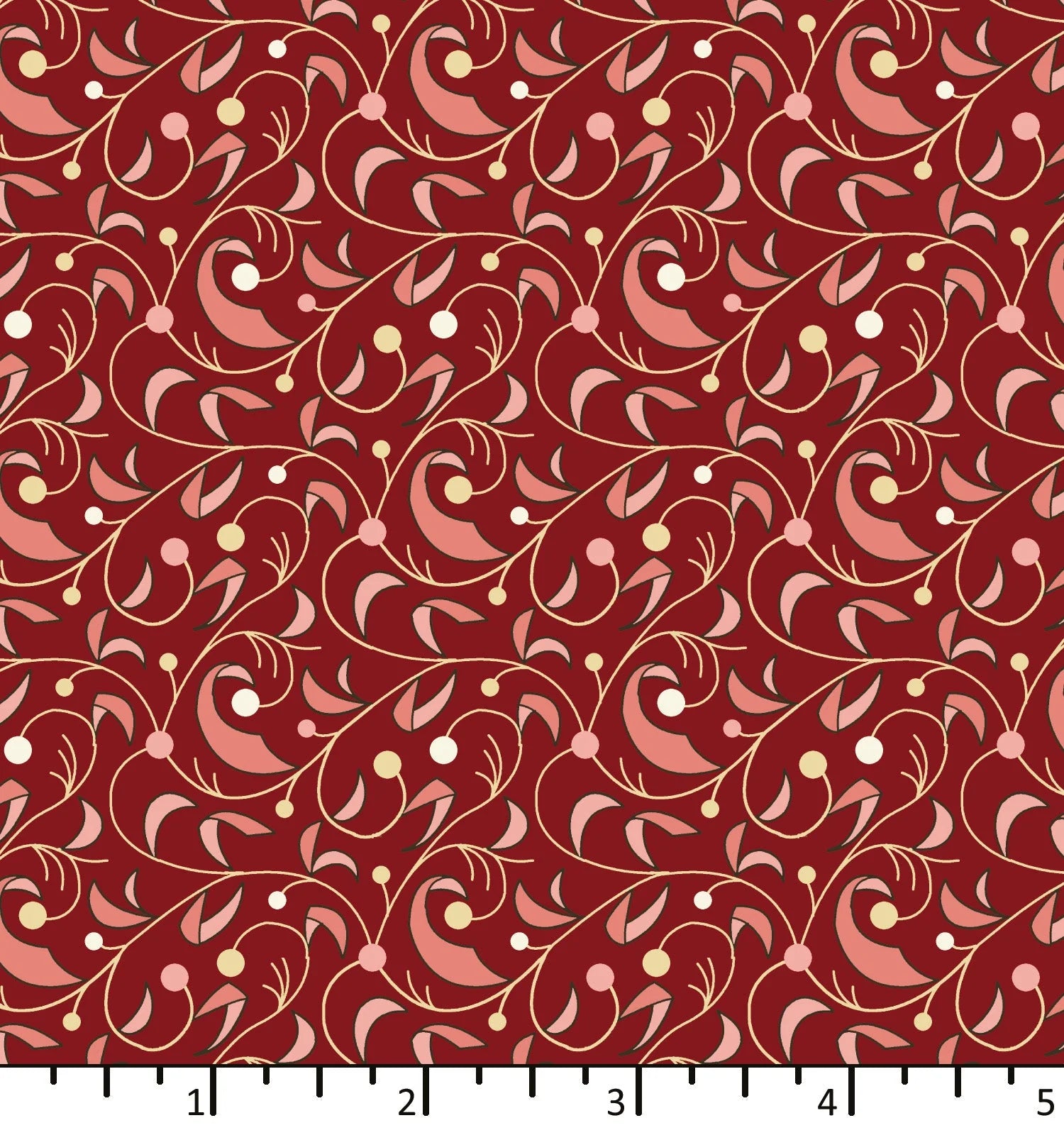 Swirling abstract vines with pink leaves and white berries fill a rich maroon background. From the Forever Collection by EQP for Quiltex. 100% Cotton, 44/45" wide.
