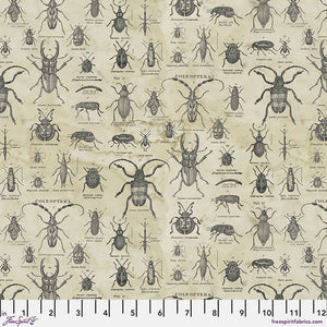 A wide variety of black and white realistic insects and beetles are arranged neatly on a parchment-like background, each one delicately labeled underneath. From the Laboratory Collection by Tim Holtz for FreeSpirit Fabrics. 44/45'' wide, 100% cotton