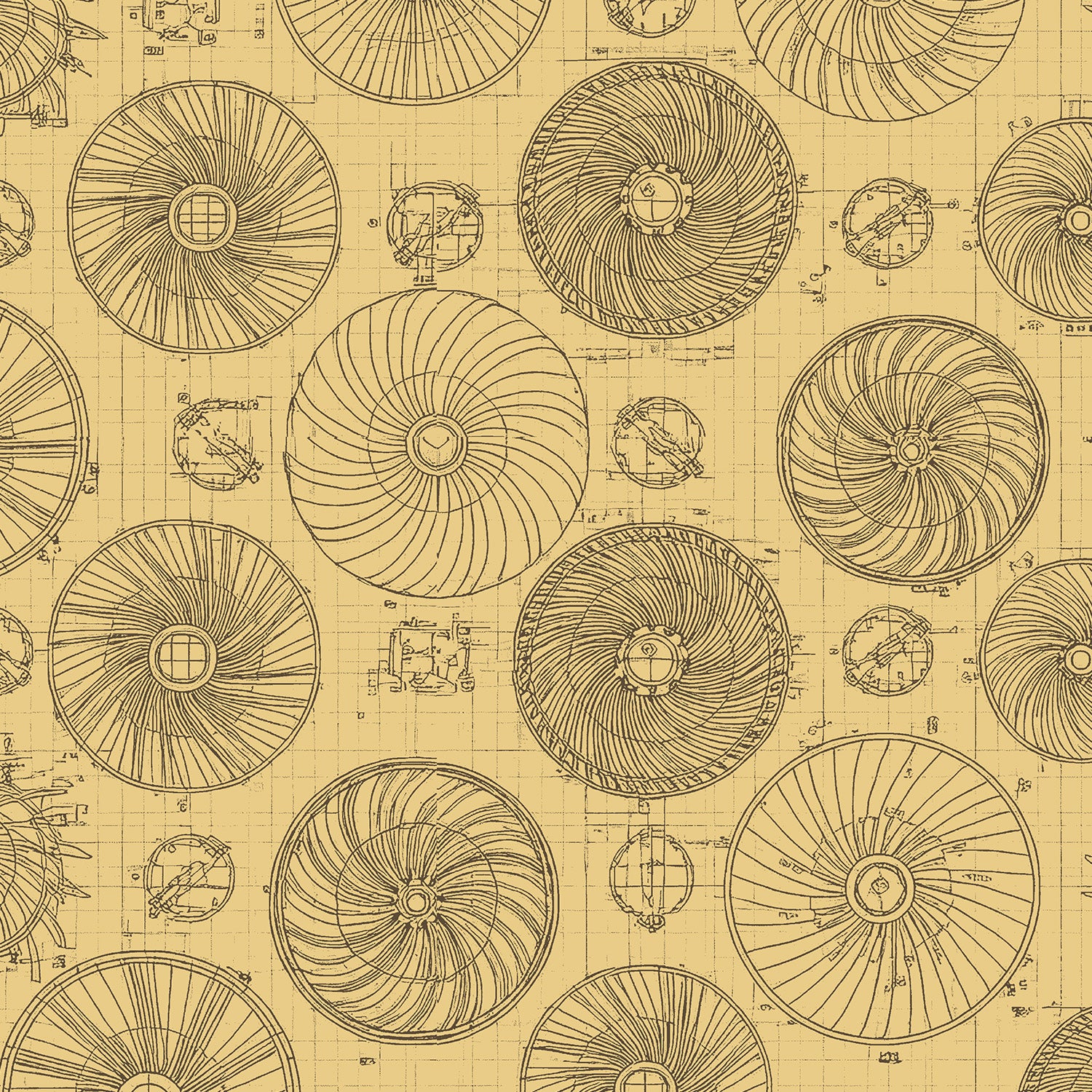 A toss of detailed sketches of airplane engine fans on a soft, parchment-colored background. From the Aviator Collection for RJR. 100% Cotton, 44/45" wide.